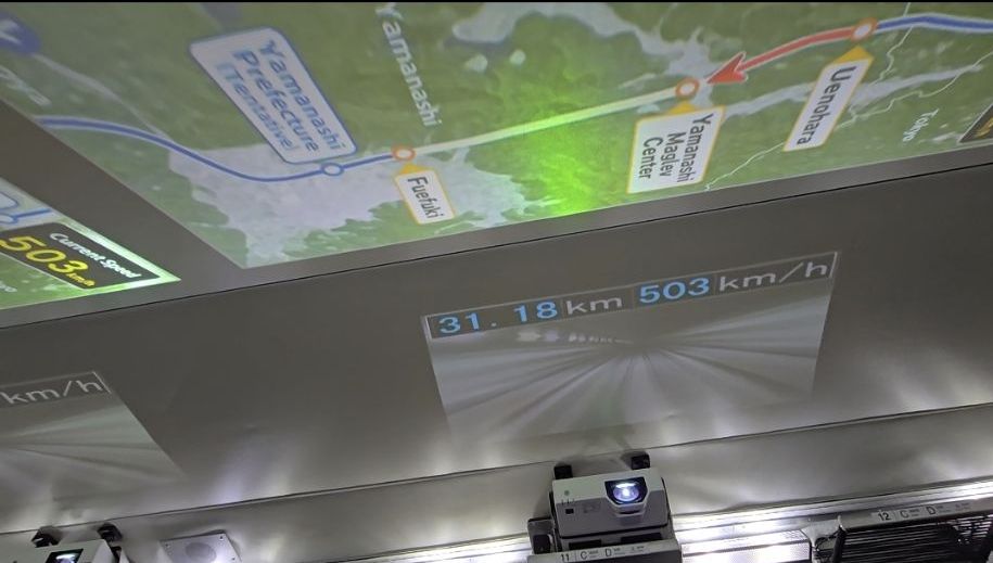 プロジェクターで天井に現在地が分かる地図と、リニアの前方カメラの映像が映し出され、現在の速度も分かるようになっている。
